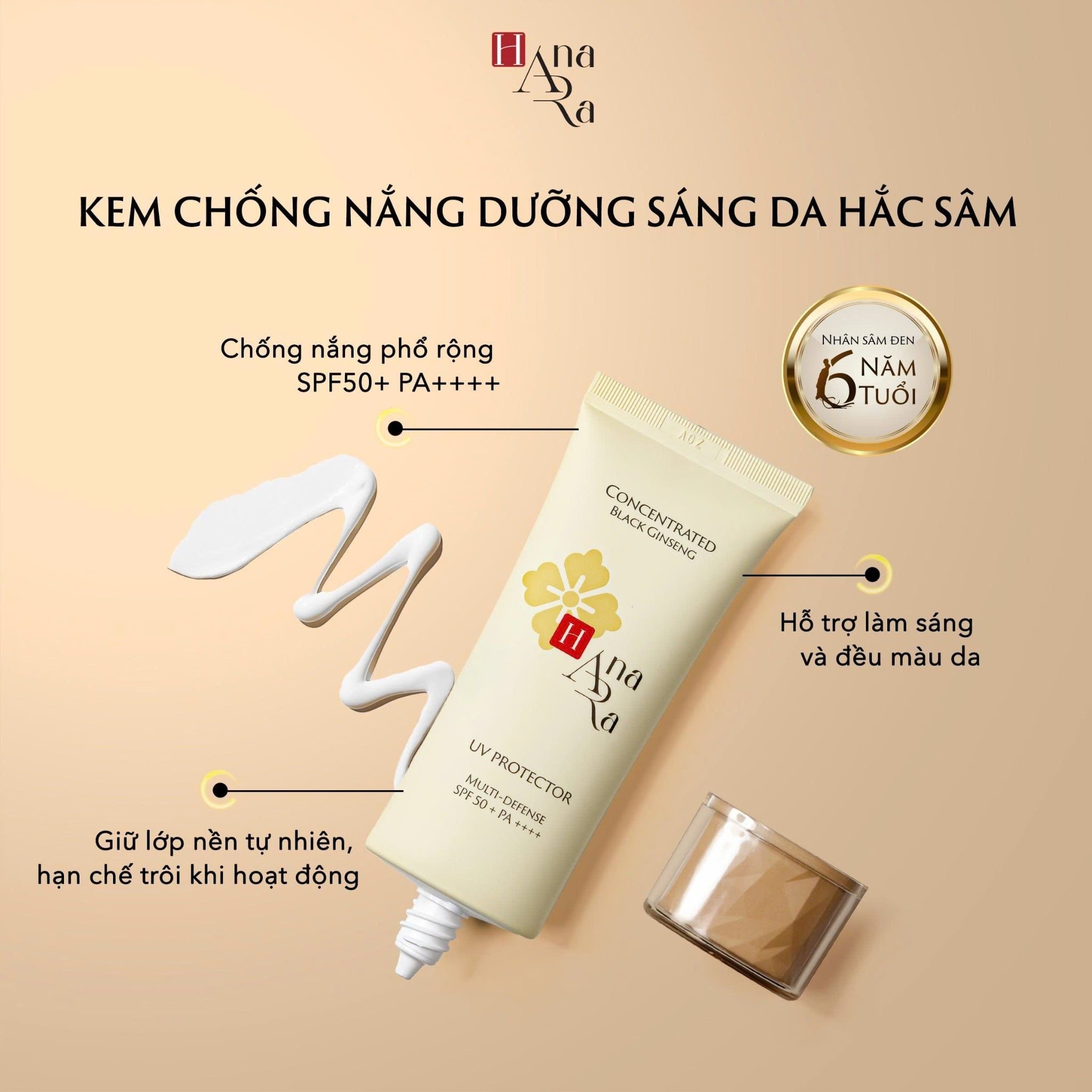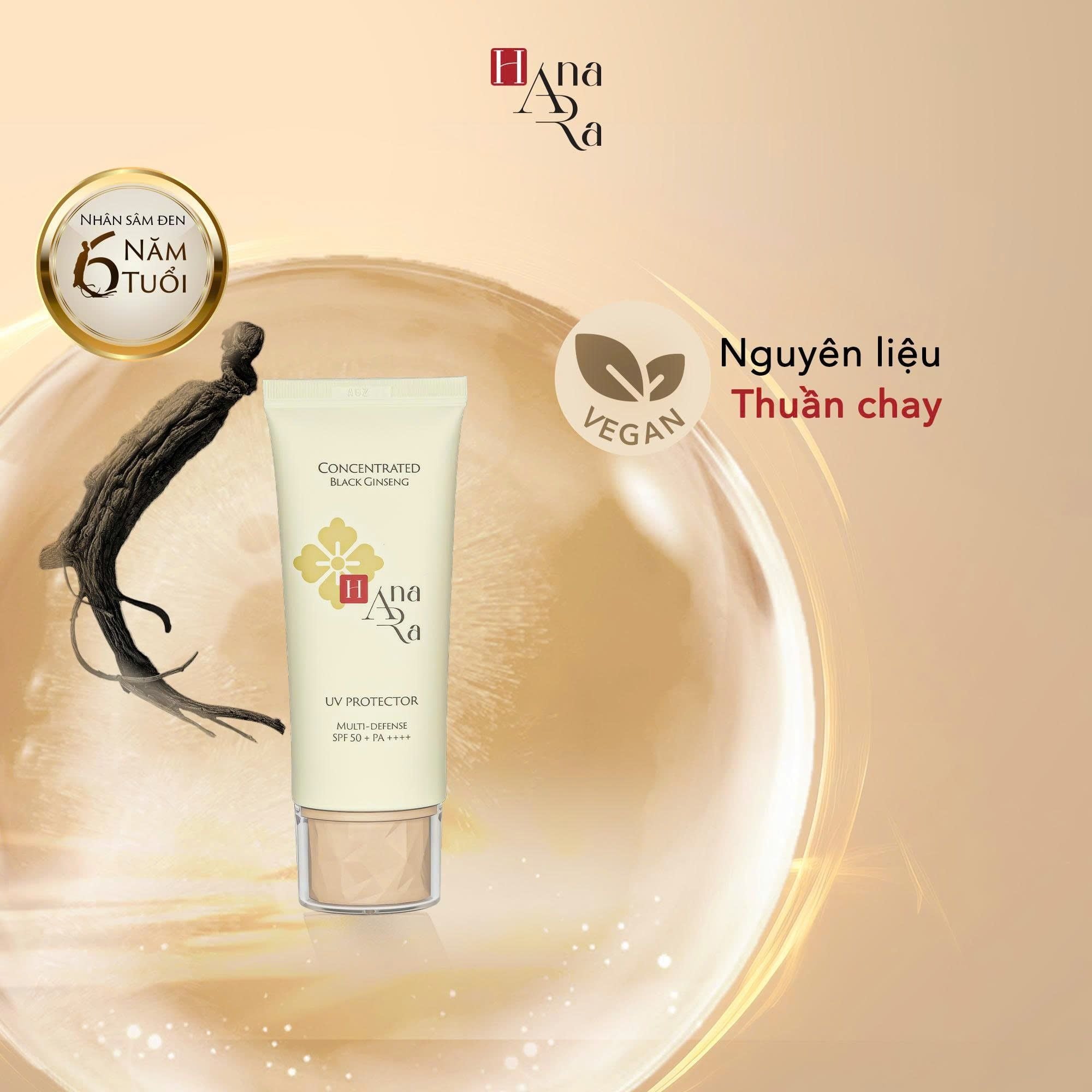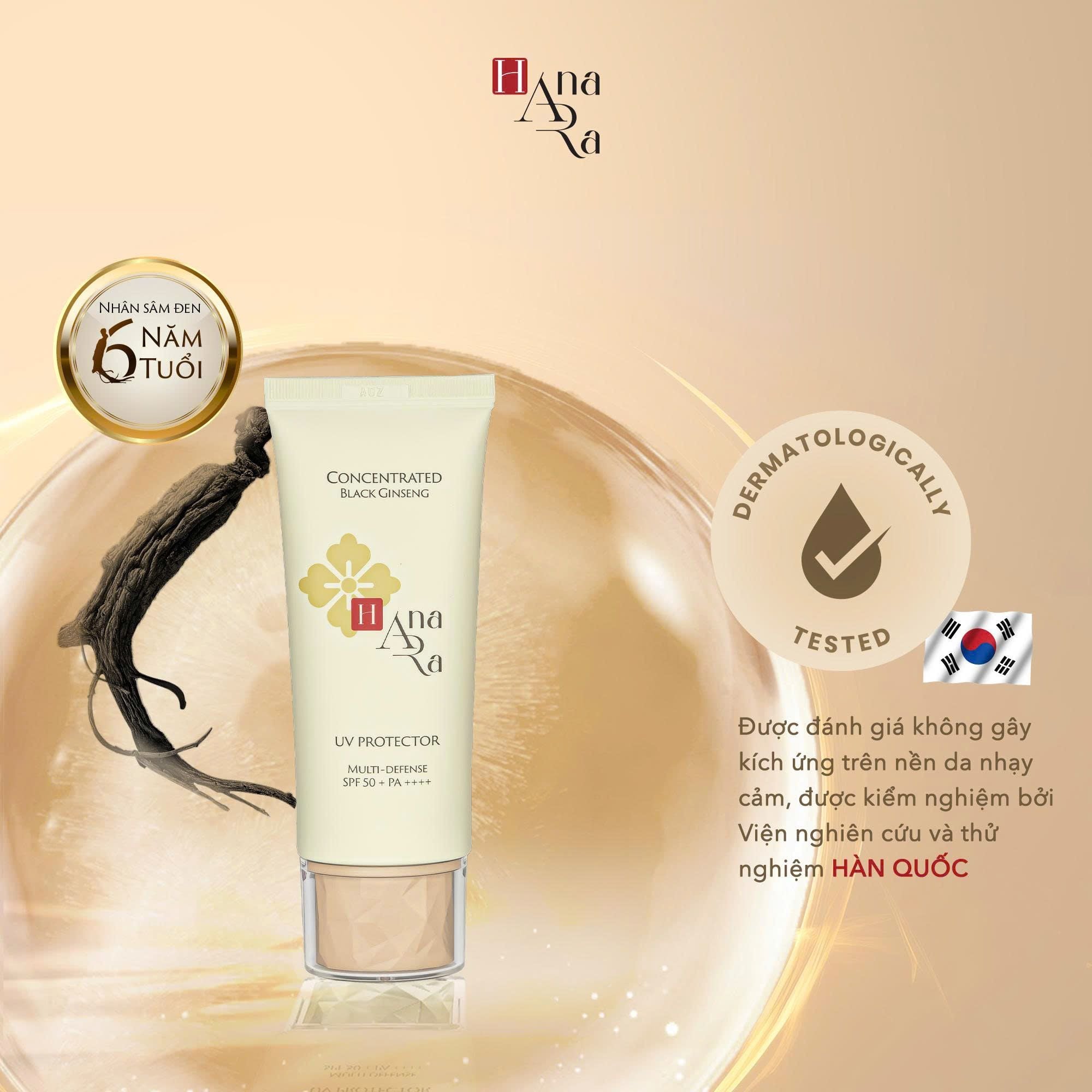 Chống nắng với chỉ số SPF 50+ PA++++ giúp hỗ trợ bảo vệ làn da trước tác động của tia UVA và UVB. Kem chống nắng Hana Ara chứa Niacinamide và Tranexamic Acid giúp cải thiện sự đều màu của da và dưỡng sáng da. Nhân sâm đen 6 tuổi giúp giảm các dấu hiệu lão hoá da.